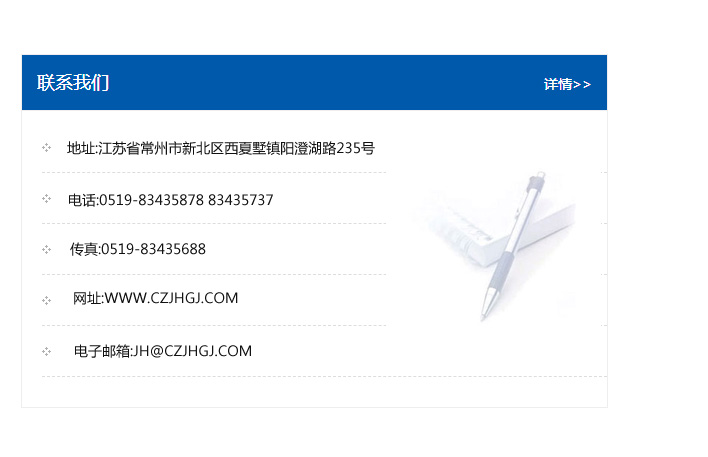 地址:常州市新北區友邦商務大廈1幢16、17層  電話:0519-85101652  傳真:0519-85112595  郵編:213022  網址:www.cz-jiayue_cn.hnpwgl.com  郵箱:xiajifengaa@163.com